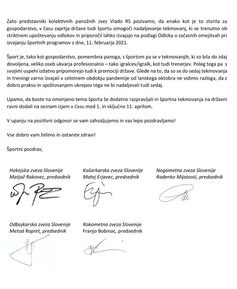Zato predstavniki kolektivnih panožnih zvez Vlado Republike Slovenije pozivamo, da enako kot je to storila za gospodarstvo, v času zaprtja države tudi športu omogoči nadaljevanje tekmovanj, ki se trenutno ob striktnem upoštevanju odlokov in priporočil lahko izvajajo na podlagi odloka o začasnih omejitvah pri izvajanju športnih programov z dne 11. februarja 2021.