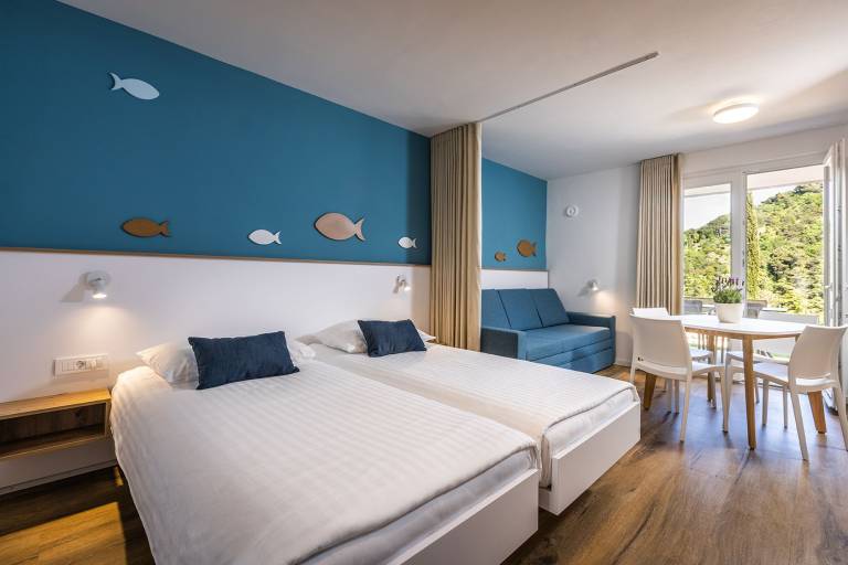 Apartmaji morja pomirjajo z modrimi odtenki in s plavajočimi ribami na stenah za popolno počitniško vzdušje. Apartmaji sonca vas pozdravljajo s sončnimi žarki na stenah in pozitivno rumeno barvo, apartmaji soli pa zgodbo o nepogrešljivi dobrini Obale pripovedujejo s svetlimi barvami in okrasno soljo za dekorativnim steklom na stenah.