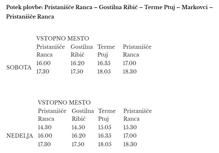 Potek plovbe je iz Pristanišča Ranca do Gostilne Ribič in naprej do Terme Ptuj, pa nazaj.