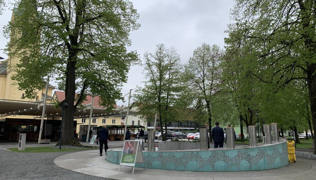 Tudi letošnje leto bodo zaznamovale omejitve in ukrepi, zato so ob fontani narisali posebne krogce za vzdrževanje razdalje med obiskovalci.