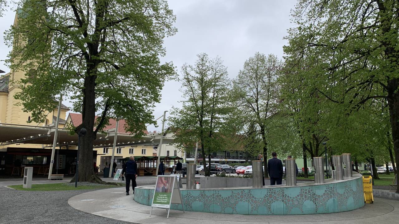 Pred fontano krogci za vzdrževanje razdaje, pipe razkužujejo z UV svetlobo