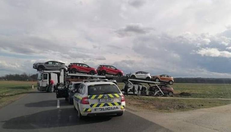 FOTO: Tovornjak, poln avtomobilov, pri obračanju nasedel in zaprl cesto