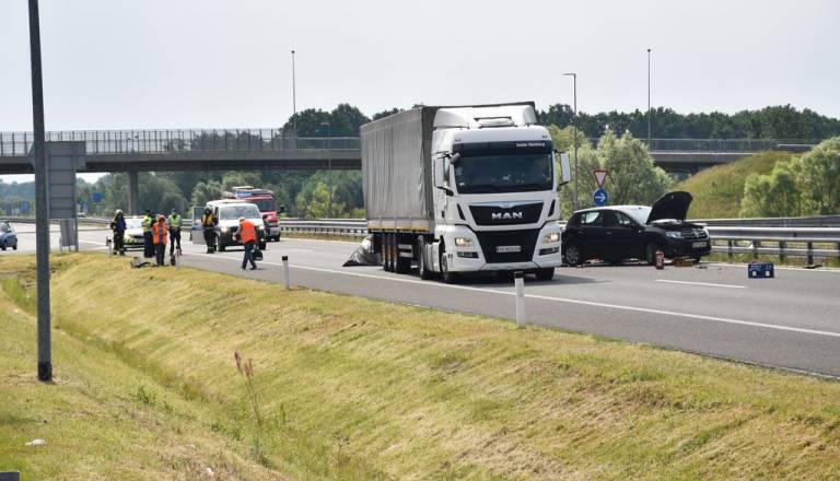 FOTO: Dve osebi poškodovani v trčenju avtomobila in tovornjaka na avtocesti