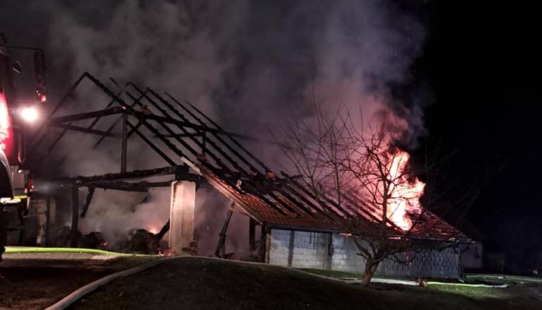 Požar uničil hlev in več kmetijske mehanizacije, domačini pravočasno rešili vso živino