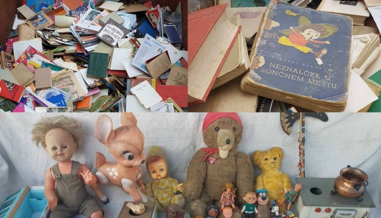 Naletela na šolski zabojnik, poln knjig, slikanic in igrač